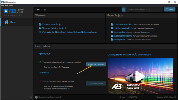 運(yùn)行A 2 B總線分析器,訪問主屏幕,單擊“檢查更新”。如果有一個(gè)較新的版本“下載”,然后“重新啟動(dòng)要安裝”以更新2 B總線分析儀的副本。