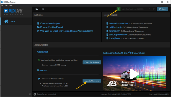 如果可用固件更新,請(qǐng)單擊“更新固件”,然后按照屏幕上的說明將新版本刷到A 2 B總線分析儀。