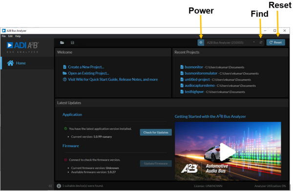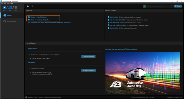 3。啟動(dòng)A 2 B總線分析儀應(yīng)用程序,并使用歡迎面板上的鏈接創(chuàng)建一個(gè)新項(xiàng)目或打開現(xiàn)有項(xiàng)目。
