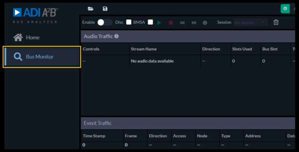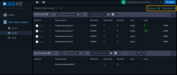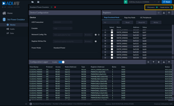 4。啟動(dòng)A2B總線分析儀應(yīng)用程序。通過從設(shè)備選擇下拉菜單中選擇它,然后單擊電源按鈕,將其連接到A2B總線分析儀設(shè)備。連接后,電源按鈕變?yōu)榫G色。