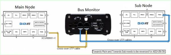 對(duì)于使用AD2438/30評(píng)估板的使用,如下圖所示,監(jiān)視器連接必須不同。確保設(shè)置上游節(jié)點(diǎn)的A2B_Control.xcvrbinv位。