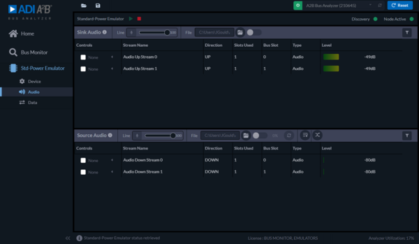 8。切換到音頻面板,以查看由節(jié)點(diǎn)來源或下沉的音頻流。使用音頻輸出控件來聆聽/保存/流動(dòng)任何感興趣的音頻流。使用音頻輸入控件從線路/spdif/file/ usb中饋入音頻,或者在總線上測(cè)試音調(diào)/循環(huán)選項(xiàng)。